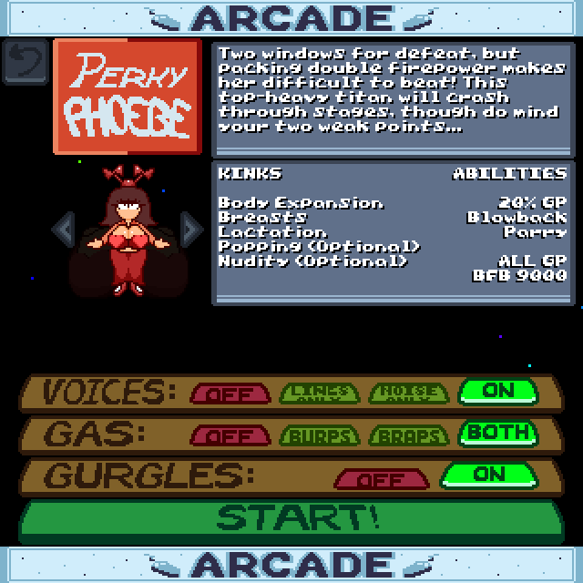 Play as Silly Sally (and other gorgeous gals) in this fixed shooter inflation/weight gain themed fetish game as she soars through space and eats her way through waves of fattening foes, getting a taste of a variety of flavors, including bigger, more shapely obstacles who do much more than float around and look cute.