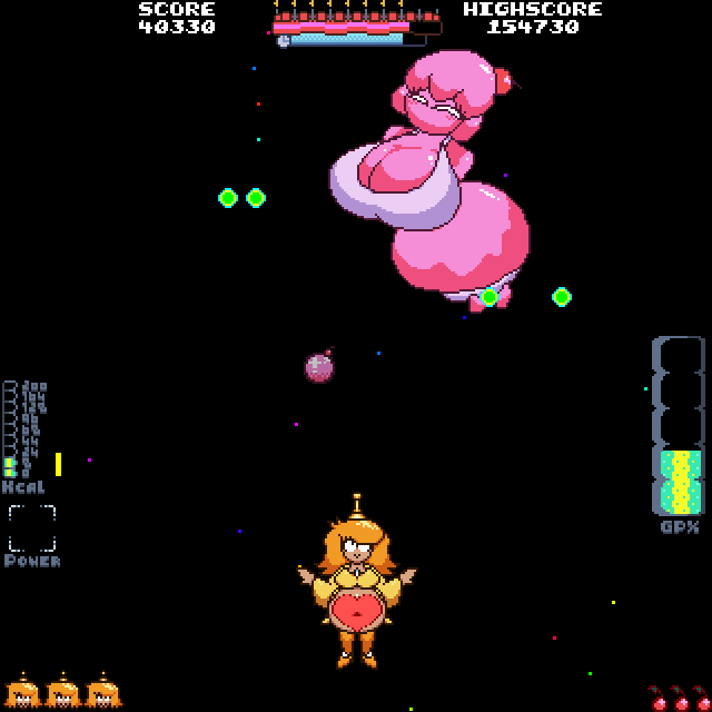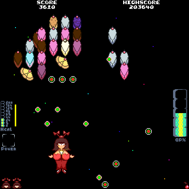 Having the girls grow larger is a great gameplay feature... Until it isn't. The fact that you're effectively crippling your own mobility and maneuverability and making yourself a bigger target as the game increasingly becomes a bullet hell is... Unrewarding, to say the least. It's not even a "high risk, high reward" situation, since you're pretty much encouraged to eat the cake... Balls? Pellets? Let's call them chunks. It increases your firepower (to varying degrees of effectiveness, depending on the character), which becomes a complete necessity once the armored cakes begin to show up. You're not really given an option here, and above Stage 16, the game becomes so saturated with enemy bullets that the only way to dodge them is to either have full GP and burp/fart them away, remain at minimum size and thus be able to move out of the way, or retain maximum size from the previous stage, and either slip into the background or blow up. The fact that the girls' firepower increasingly becomes ineffective at higher Stages becomes particularly painful, and the fact that the only way to increase it is through crippling our mobility and making us a bigger target (and even then, some of the girls' firing method is just ineffective to begin with). There should really be either a temporary firerate and/or damage booster item (maybe a different cake?), or have the girls' firepower just naturally become faster/harder hitting by default as the game advances up the stages, because cycling between having no effective firepower and not being able to dodge due to our size and speed, while the enemies only get stronger and stronger is really demoralizing and frustrating.